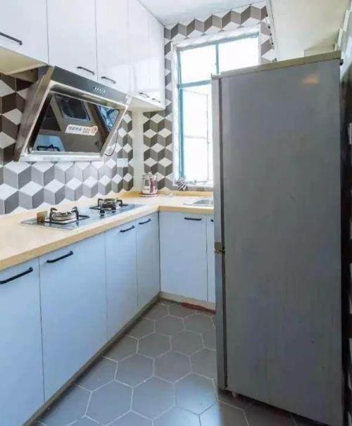旧房改造改造之后,墙面重新贴了新的瓷砖,旧的柜子全部都拆了,重新请人打了新的橱柜。白色的光面吊柜反光性很强,让整个空间显得更加的明亮。