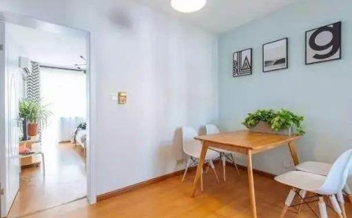 旧房改造餐厅搬到了厨房外面的过道上,墙面刷成了清新活泼的浅绿色,木地板和木桌看上去优雅自然,造型简约又时尚个性。